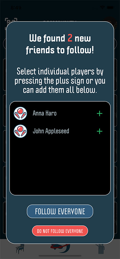 The Community tab provides a river of scores, challenges and achievements from all the Scorbit users you follow. You can curate a list of pinball influencers, friends, tournament champions, designers or family, and the feed will display everything they share. As explained previously, through the account menu, you may edit and access your own profile, which highlights your name, display name, number of followers and people you follow as well as you scores.
